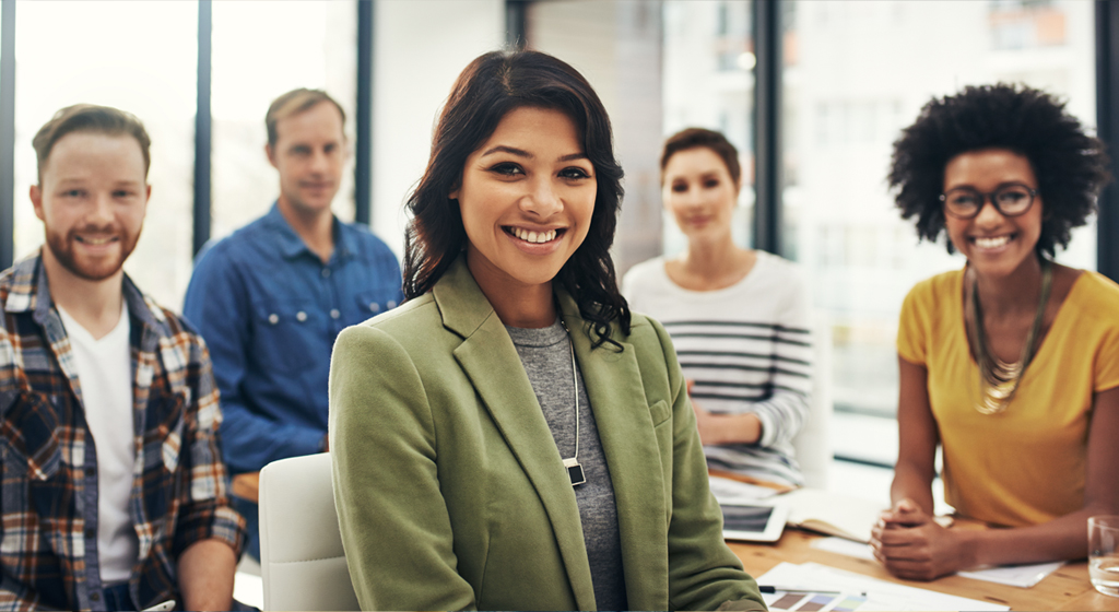 People sitting at a conference table all turned to face the camera and smile