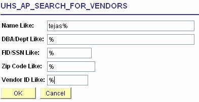 1) Run the UHS_AP_SEARCH_FOR_VENDORS query: You can search by vendor name, tax ID, zip code, or the UHS vendor ID number. Enter a % (wildcard) for fields that are not in your search criteria.