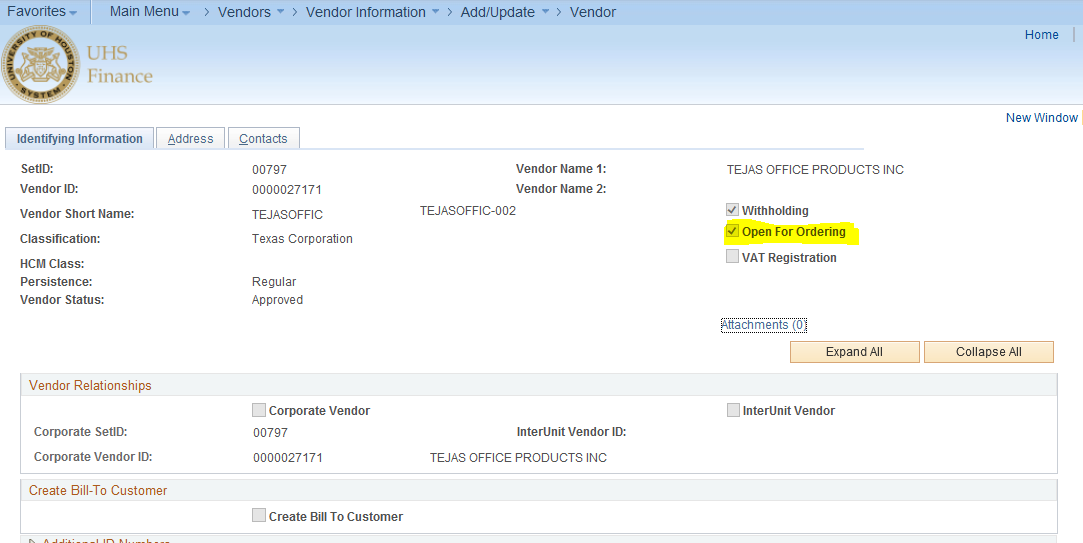 3) Review the Vendor File: You can also tell if the vendor is on hold by looking at the Open for Ordering box